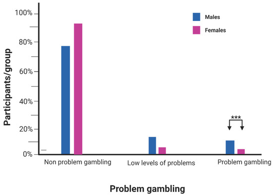 Sex differences in problem gambling at w4: male sex (10.9%) is approximately four folds more likely to be problem gamblers compared to females (2.7%). Majority of males (76%) and females (92%) were non-problem gamblers. *** represents statistically significant associations (p-value < 0.0001).