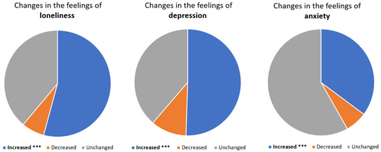 Changes in the psychological traits among participants with increased gaming activity during the COVID-19 pandemic: participants who reported an increase in their gaming were more likely to report an increase in feelings of loneliness (54.2%, p < 0.001), feelings of depression (50.5%. p < 0.001), and anxiety (35.2%, <0.001). *** represents p-value < 0.001.