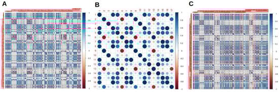 Cross correlation matrixes for radiomics features (RaF) for scanner 1 (A), scanner 2 (B) and both the scanner considered together (C).