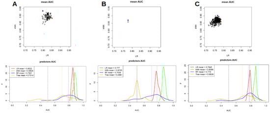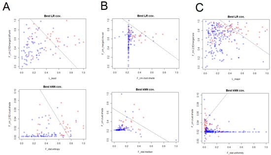 Visual representation with the couples of RaF with best performances at LR and k-nearest neighbors (kNN) analyses for scanner 1 (A), scanner 2 (B) and both the scanner considered together (C).