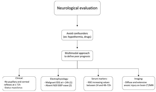 Regarding, biochemical data, blood biomarkers are presumed to correlate with the extent of lesions after CA. Neuron specific enolase (NSE), S-100B, and Tau are biomarkers which are released following injury to neurons, glial cells, and axons. Recently, microRNAs (miRNAs) have been identified as candidate biomarkers, although more investigations are needed to define protocols for their use. Electroencephalogram (EEG), in association with other predictors, can be used as a predictor of severity. The main patterns related to poor prognosis are status epilepticus or burst suppression after rewarming over an unreactive background. However, there is a lack of standardization of the different electrocardiographic patterns and their prognostic correlations. Short-latency somatosensory evoked potentials also can be used in neuroprognosis. The absence of the N2O wave is among the most robust predictors to be tested at 72 h after ROSC. Computerized tomography with cerebral edema and resonance magnetic hyperintense areas are the main imaging findings correlated with poor neurological outcomes in CA patients [158].