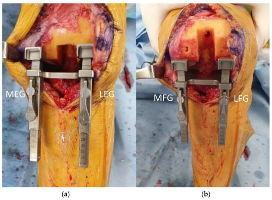 Measuring four total knee arthroplasty gaps (MFG, LFG, MEG, LEG) using a device similar to a lamina spreader and a tensor with a slide ruler. (a) Measurement of extension gaps (MEG, LEG). (b) Measurement of flexion gaps (MFG, LFG); MEG: medial extension gap; LEG: lateral extension gap; MFG: medial flexion gap; LFG: lateral flexion gap.
