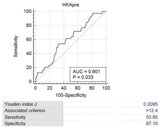 A ROC analysis was performed to determine threshold values for the HKA varus angle to define the trapezoidal group (trapezoidal gap > 3 mm with at least one of the FGD and EGD). The area under the curve (AUC) for the HKA varus angle in the trapezoidal group was 0.601 (95% confidence interval [CI], 0.540–0.660). An HKA varus angle of 12.4° was found to be the cutoff value for the trapezoidal group, with a sensitivity of 53.85% and specificity of 67.10% (Figure 5).