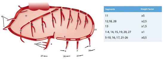 Preoperative coronary angiographies (up to one year before surgery) were used to score the severity of coronary sclerosis for each patient. The coronary artery sclerosis greater than or equal to 20 and 50 (CAGE ≥ 20 and CAGE ≥ 50) method was used to score the extent and severity of the coronary artery sclerosis [11,12,13]. This method scores non-obstructive coronary sclerosis (=CAGE 20, 20–49% coronary obstruction) and obstructive coronary sclerosis (=CAGE 50, ≥50% coronary obstruction) for 28 different coronary segments (Figure 1). The coronary angiographies were independently scored by two researchers.