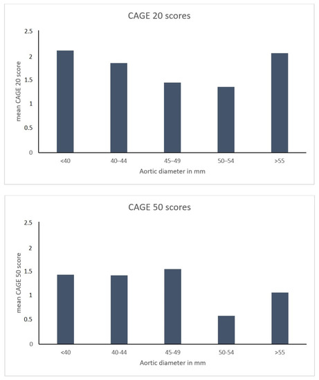 CAGE scores per diameter. Sensitivity analysis using ascending aortic diameter as a continuous variable did not indicate a correlation between CAGE 20 scores (upper figure, p = 0.894) or CAGE 50 scores (lower figure, p = 0.317) and aortic diameter.