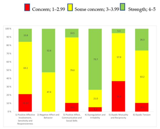 The mean scores for the PCERA subscales are presented in Table 4. The high mean scores on parental subscales 2 (Negative Affect and Behavior) and infant subscale 4 (Dysregulation and Irritability) indicate strength areas in parent–infant interactions, suggesting low levels of negative affect both in parents and infants. For the parent subscale 1 (Positive Affective Involvement, Sensitivity and Responsiveness), infant subscale 3 (Positive Affect, Communicative and Social Skills) and parent–infant subscale 6 (Dyadic Tension), mean scores indicate areas of some concern, while the mean score for parent–infant subscale 5 (Dyadic Mutuality and Reciprocity) indicates an area of concern.