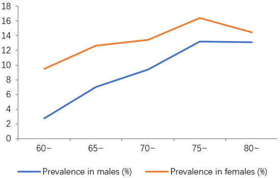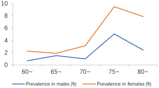 This current study identified 58 patients with AD and 404 patients with MCI among the elderly population aged 60 years or above living in the Hubei Province. The overall prevalence of AD and MCI was 1.44% and 10.07%, respectively, which is significantly lower than the prevalence rates reported in other domestic populations [2,24,25]. The prevalence of AD in males was significantly lower than that in females (29.31% vs. 70.69%); the same was observed for MCI (37.13% vs. 62.87%). The prevalence of MCI in females was significantly higher than that of males for all five age groups in this study. This may be related to women’s longer life expectancy than men, lower estrogen levels after menopause, lower levels of education, less sleep (more housework) and more mood swings [26].