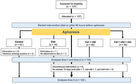 Flowchart of the studied population. Control: no supplementation; Diet: diet; cal + vitd: calcium carbonate + vitamin D; cal + vitd + min: calcium carbonate, minerals + vitamin D. Blood samples were taken at the beginning (time-1); after finishing the plateletpheresis (time-2); and fifteen days later from the participating donors (time-3).