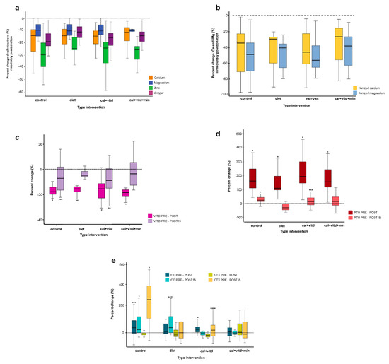 In comparison with the control group as a reference, statistical differences were observed in PHT (diet p < 0.001; cal + vitd p= 0.003; cal + vitd + min p < 0.001) and for CTX (diet p = 0.019; cal + vitd p = 0.038; cal + vitd + min p < 0.017).