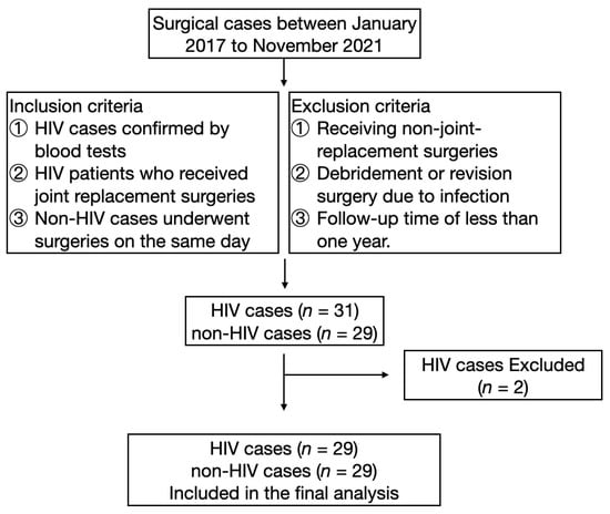 This research protocol has been reviewed and approved by the ethics committee of our institution ([2015]084-1). Informed consent to participate in this retrospective study was obtained from all patients. The cases of HIV-infected patients admitted to our department from January 2017 to November 2022 were retrospectively reviewed. Non-HIV patients who underwent surgery on the same day were included as controls. Patients’ demographic information (age, sex, surgical side, past medical history, Harris Hip Score (HHS), perioperative laboratory tests (including white blood cell count (WBC), C-reactive protein (CRP), erythrocyte sedimentation rate (ESR), hemoglobin (Hb), albumin (ALB), CD4+ T-cell count, CD8+ T-cell count, HIV viral load (VL)), American Society of Anesthesiology (ASA) score, operation time, intraoperative blood loss, and transfusion rate) were collected; patients’ perioperative complications, hospital stay, infection occurrence rate, and the results of the last follow-up were recorded (including inflammation markers of WBC, CRP, ESR, and the HHS score).