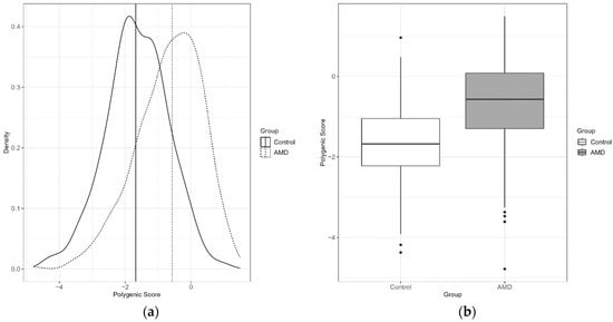 (a) Distribution of PRS values per individual as density plot with median values for case/control groups marked as a vertical lines; (b) Boxplots showing the distribution of PRS in control and AMD groups.