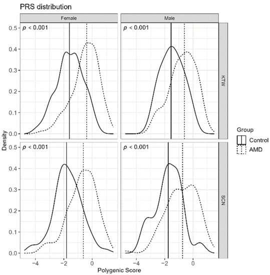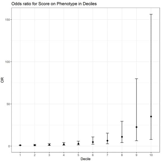 Taking age into consideration, the median PRS values for cases in the age groups 60–69, 70–79 and 80+ were significantly higher with p < 0.001. Further analysis showed that 92% of individuals with PRS in the 10th decile developed AMD (Figure 4).