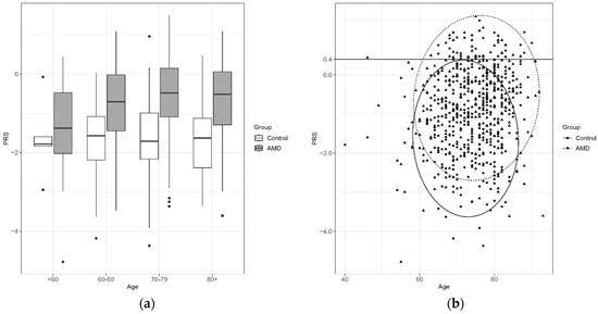 PRS by age (a) Boxplot showing the differences in mean PRS in age groups for controls and AMD cases; (b) Values of PRS depending on age for controls and AMD cases with 95% confidence level ellipse. The horizontal line corresponds to the 10th decile cut-off at 0.4.