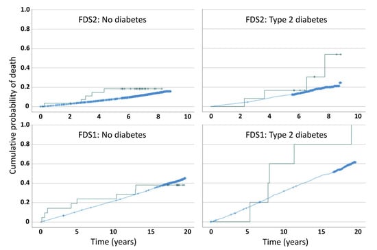 FDS1 and FDS2 were similarly conducted, observational, longitudinal studies of known diabetes conducted in the same zip code-defined geographic area surrounding the port city of Fremantle in Western Australia (WA) [,]. FDS1 recruited participants between 1993 and 1996 and FDS2 between 2008 and 2011. Both studies utilized the same strategy to identify all potential participants with known diabetes in the area from hospital, clinic and primary care patient lists, widespread advertising through local media, pharmacies, optometrists, networks of health care professionals, but, in the case of FDS2, third-party mail-outs to registrants of the Australian National Diabetes Services Scheme and the National Diabetes Register were also employed []. Details of recruitment, sample characteristics including classification of diabetes types, and non-recruited people identified with diabetes in the catchment area have been published [,]. The FDS1 protocol was approved by the Fremantle Hospital Human Rights Committee, and the FDS2 protocol by the Human Research Ethics Committee of the Southern Metropolitan Area Health Service. All participants gave written informed consent. The WA Data Linkage System (WADLS) [] was used to match FDS1 and FDS2 participants with residents in the study catchment area who did not have documented diabetes and to obtain further clinical data. Linkages with clinical databases were approved by the WA Department of Health Human Research Ethics Committee.