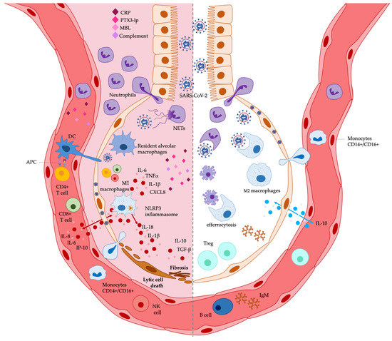 Alterations mainly consist of deviated innate immunity associated with dysregulated and impaired adaptive immune responses, leading to the failure in local and systemic immune regulations and homeostasis. In patients undergoing ARDS, the sensing of SARS-CoV-2 via TLRs and RIG-1 by alveolar epithelial cells, endothelial cells and alveolar macrophages results in multiple alterations of innate immune responses. Particular attention has been given to the suppressed antiviral immune response induced by the early stage of virus infection in the lungs, mainly consisting of the early inhibition of IFN-I responses, which allows high levels of virus replication in pulmonary cells [58]. Subsequently to this early phase, the excessive virus replication in patients with ARDS promotes excessive IFN response associated with excessive production of inflammatory mediators, like interleukin-(IL)-1β, IL-6, tumor necrosis factor (TNF) α and neutrophil-recruiting chemokines (e.g., CXCL8/IL-8) [55,56] by immune and non-immune pulmonary cells. Overproduction of inflammatory mediators activates endothelial cells and induces excessive recruitment in the lung of circulating inflammatory cells, mostly composed of monocytes, neutrophils, and T cells [50,59,60,61]. The immunopathology of ARDS largely depends on the phenotype and the functionality of monocytes/macrophages in the lung, including resident alveolar macrophages and pulmonary infiltrating peripheral blood-derived monocytes (Table 3) [59]. Indeed, the ratio and the balance between pro-inflammatory (M1) and anti-inflammatory (M2) macrophages strongly influence the course and severity of lung pathology [60]. Peripheral blood-derived monocytes (mainly M1 macrophages), recruited by cytokines into the alveolar space and activated by IFN-γ, secrete a further amount of pro-inflammatory cytokines and induce apoptosis of alveolar cells through the release of TNFα. Monocytes and macrophages in the lung also express high NLRP3 inflammasome (Table 3) [62], a cytosolic multiprotein complex, which facilitates the release of IL-1β and IL-18 cytokines, leading to inflammatory lytic cell death. Macrophages also express low levels of major histocompatibility complex (MHC) surface molecules, resulting in the reduction in their APC function, as well as the APC function of DCs is also decreased in severe acute COVID-19 (Table 3) [63,64]. Then, pulmonary macrophages acquire a profibrotic transcriptional phenotype, and the pulmonary pro-inflammatory milieu can overwhelm homeostatic tissue repair functions mediated by anti-inflammatory M2 macrophages [56,59,60], resulting in severe tissue damage, depletion of lung immune cells and pulmonary fibrosis of ARDS.