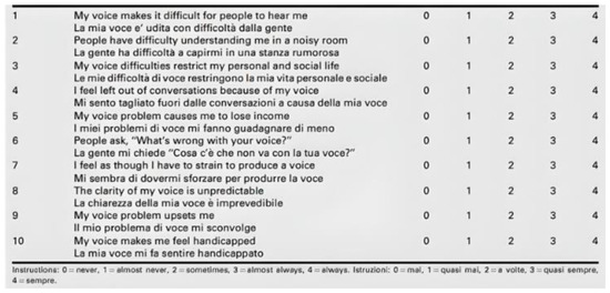 - Forti, S.; Amico, M.; Zambarbieri, A.; Assi, C.; Pignataro, L.; Cantarella, G. Validation of the Italian Voice Handicap Index-10. J. Voice 2014, 28, 263.e17–263.e22. [Google Scholar] [CrossRef]