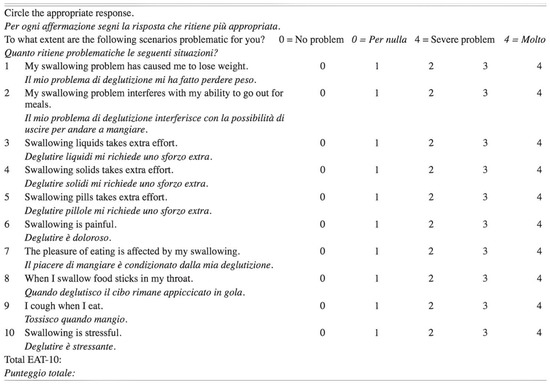 Patients were then evaluated for voice and swallowing disorders that may have occurred after surgery. Two questionnaires were used for this purpose. They are also validated for use in the Italian language and are available online free of charge. Their purpose is to investigate the experiences of patients, before and after surgery, through the evaluation and the extent of specific disorders closely related to the voice and swallowing. For the first group of disorders, we used the Voice Handicap Index (VHI-10; Figure 1), and for the second one, we used the Eating Assessment Tools (EAT-10; Figure 2).