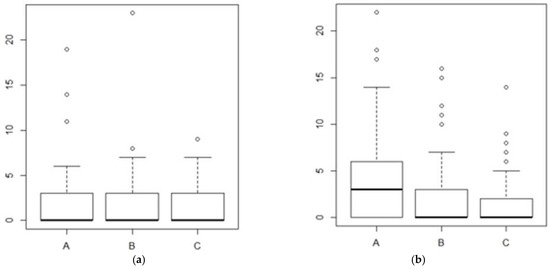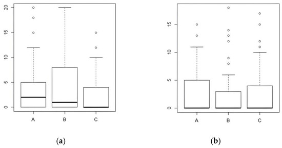 Applying the same statistical methodology (non-parametric Friedman test), we analyzed the variation in scores related to the patient’s perception of the efficiency of swallowing mechanisms, detected with the EAT questionnaire. In addition, in this case, a comparison was made between the preoperative (Figure 5a) and postoperative data (Figure 5b) based on the techniques that were used during surgery:
