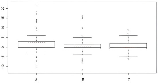 Differences in the total scores, for single monitoring technique, of preoperative VHI and postoperative VHI. A = visual technique; B = intermittent nerve monitoring; C = continuous nerve monitoring.