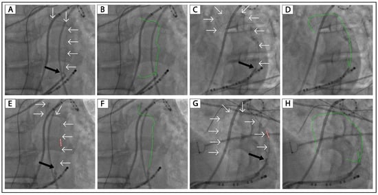 Figure 2 displays another patient (Patient No. 3) with VOM collateral circulation to the left atrium. After a slow injection of 2 mL of ethanol, there was still collateral circulation and no localized staining (Figure 2E). After 4 mL of ethanol infusion, there was lesser collateral circulation than in Figure 2E and a small area of localized staining (Figure 2F). After 8 mL of ethanol infusion, there was no collateral circulation, and the size of localized staining was more prominent, as shown in the LAO and RAO projections (Figure 2G,H). Supplemental Figures S2 and S3 show another two patients with VOM collateral circulation to the left atrium in whom ethanol infusion was successful.