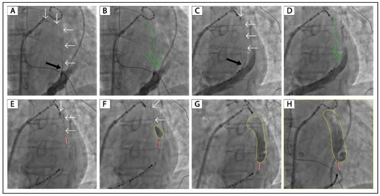 Successful ethanol infusion in a VOM with collateral circulation to the left atrium. (A,C): Non-occluded venograms of VOM in the RAO and LAO projection, respectively. (B,D): Highlighted VOMs of panels (A,C), respectively. (E–G): Balloon occluded venograms of VOM in the LAO projection after 2, 4, and 8 mL of ethanol infusion, respectively. (H): Balloon occluded venogram of VOM in the RAO projection after 8 mL of ethanol infusion. The black arrow indicates the ostium of VOM. The white arrows and green lines indicate the drainage of the VOM. The tubule outlined in red indicates the angioplasty balloon. The yellow circles indicate localized myocardium staining. VOM, the vein of Marshall; RAO, right anterior oblique; LAO, left anterior oblique.