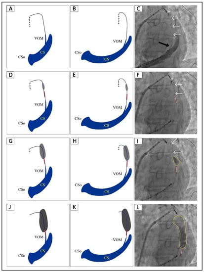 A step-by-step illustration of ethanol infusion in a VOM with collateral circulation. (A,B): Schematic diagram of non-occluded venograms of VOM in the RAO and LAO projection, respectively. (D,G,J): Schematic diagram of balloon occluded venograms of VOM in the RAO projection after 2, 4, and 8 mL of ethanol infusion, respectively. (E,H,K): Schematic diagram of balloon occluded venograms of VOM in the LAO projection after 2, 4, and 8 mL of ethanol infusion, respectively. (C): Non-occluded venogram of VOM in the LAO projection. (F,I,L): Balloon occluded venograms of VOM in the RAO projection after 2, 4, and 8 mL of ethanol infusion, respectively. The black arrow indicates the ostium of VOM. The white arrows indicate the drainage of the VOM. The tubule outlined in red indicates the angioplasty balloon. The gray and black shadows in Panels (D,E,G,H,J) and yellow circles in Panels (I,L) indicate localized myocardium staining. The black dots in Panels (A,B,D,E,G,H) indicate contrast leakage through the collateral circulation. VOM, the vein of Marshall; RAO, right anterior oblique; LAO, left anterior oblique.