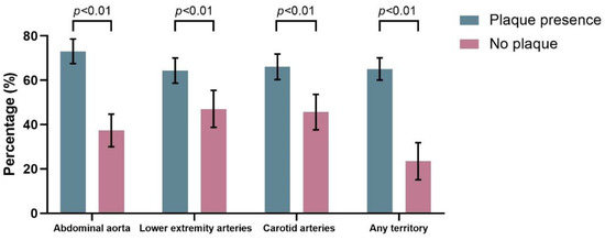Continuous variables are presented as the means ± standard deviations, and categorical variables are expressed as frequencies and percentages. Student’s t-test, Mann–Whitney U test and chi-square test were used for comparisons between groups. Multiple logistic regression models were constructed to identify risk factors associated with atherosclerotic plaques in the carotid arteries, abdominal aorta, lower extremity arteries, or any of the three territories. The results of the logistic analysis are expressed as odds ratios (ORs) and 95% confidence intervals (95% CIs). p < 0.05 was considered indicative of statistical significance. All statistical analyses were performed using SPSS version 26.0 (IBM, Armonk, NY, USA).