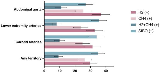 The prevalence of SIBO is shown in Figure 1. SIBO was found in 179/245 patients with abdominal aortic plaque compared to 62/166 who did not have abdominal aortic plaque (73.1% vs. 37.3%, p < 0.01). Among 411 patients, 275 had at least one arterial plaque in the lower extremities, and SIBO was substantially more common in those with lower extremity plaques (64.3% vs. 47.0%, p < 0.01). The prevalence of SIBO was significantly higher in those with a carotid plaque than in those without carotid plaque (66.0% vs. 45.6%, p < 0.01). Overall, the prevalence of SIBO was significantly higher in those with a plaque in any of the above three territories than in those without any plaque (65.0% vs. 23.4%, p < 0.01). Moreover, we also analyzed the subtypes of SIBO in different groups (Figure 2). The results showed that in all four groups above, the prevalence of H2-positive was significantly higher in patients with plaques than in those without plaque (p < 0.05). However, only in the abdominal aorta and the any-territory group did we observe a higher prevalence of CH4-positive in patients with plaques than in those without (p < 0.05).