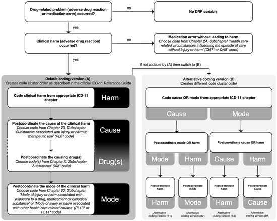 Prior to the analysis, two pharmacists (W.A. and L.J.-P.) with experience in ICD-10 coding completed the ICD-11 training package by the WHO, which consisted of 12 education tool units [14]. We specified the ‘Quality and Safety Algorithm’ from the ICD-11 Reference Guide for DRP coding and used the default coding version (A) for our analysis [15,16] (Figure 1).