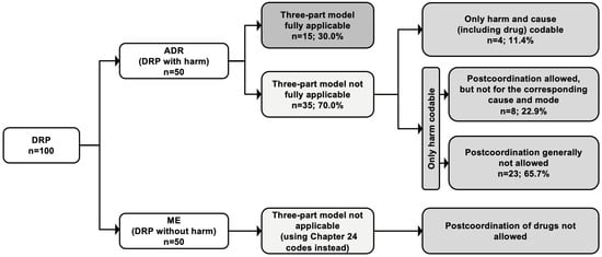 For MEs without injury or harm, the three-part model does not apply. However, in 41 out of 50 (82.0%), the MEs not associated with clinical harm could be coded by using Chapter 24 codes (Subchapter ‘Health care related circumstances influencing the episode of care without injury or harm’). Nevertheless, for these codes, no postcoordination of the causing drugs was allowed, which made an assignment of the drugs to MEs impossible.