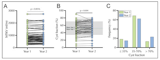 Analysis of the mean log htTKV revealed a significant increase (p < 0.001) over 1 year in the longitudinal cohort (Figure 2A). Similarly, the mean cyst fraction, which was defined as the cyst volume divided by the kidney volume, increased significantly (year 1: 50.82%; year 2: 52.71%; p = 0.004, Figure 2B). The cyst fraction was further divided into 3 groups, as previously described [12], and included participants with low cyst fraction values (≤ 35%), intermediate range (35–70%), and high values (>70%) (Figure 2C). In the longitudinal cohort and both subcohorts, the majority of study participants were classified as having an intermediate cyst fraction in both years. While the proportion of low and medium cyst fraction decreased between year 1 and 2, the proportion of high cyst fraction increased (Figure 2C and Supplemental Figure S1).