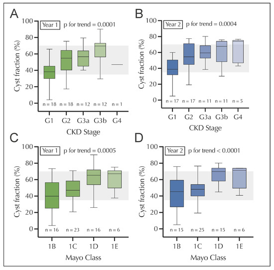 Cyst fraction (%) according to CKD stage (A,B) and Mayo class (C,D) among ADPKD patients for year 1 (A,C) and year 2 (B,D). CKD, chronic kidney disease. The grey area in (A–D) depicts the medium cyst fraction (35–70%).