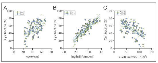 Correlation of cyst fraction with patients age ((A) year 1: ρ = 0.531, p < 0.001; year 2: ρ = 0.502, p < 0.001) log htTKV ((B) year 1: ρ = 0.881, p < 0.001 year 2: ρ = 0.832, p ≤ 0.001) and eGFR ((C) year 1: ρ = −0.573, p < 0.001, year 2: ρ = −0.560, p < 0.001) of the longitudinal cohort. Spearman correlation was performed for non-parametric data. eGFR, estimated glomerular filtration rate; htTKV, height adjusted total kidney volume.