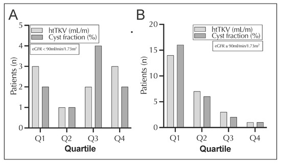 Figure 5B shows that the cyst fraction in the group of individuals with an eGFR of ≥90 mL/min/1.73 m2 placed two more patients in the first quartile than the htTKV. In contrast, there were only three individuals in the third and fourth quartiles of the cyst fraction, whereas there was a total of four in those of the htTKV.