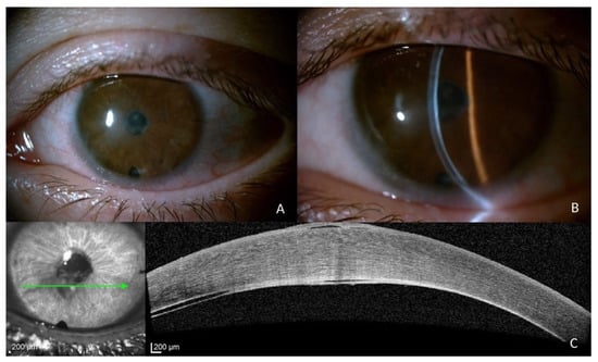(A) Slit-lamp image showing significant fibrotic changes at the posterior corneal stroma–Descemet membrane interface and an inferior iridotomy; (B) the thin beam of the slit-lamp shows the complete adhesion of Descemet’s membrane; (C) AS-OCT after the second intracameral injection of SF6 20% showing the definite resolution of the Descemet membrane detachment.