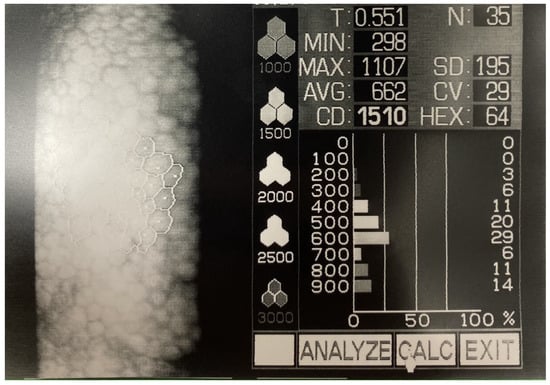 The patient was treated with oral 25 mg Prednisone once a day (tapering down the dose over 14 days), 125 mg oral Acetazolamide thrice a day, topical Dexamethasone four times a day (tapering down the dose over ten days), topical Timolol-dorzolamide twice a day, and a topical hypertonic saline solution four times a day. After two months, given the persistent DMD, an intracameral injection of 20% sulphur hexafluoride (SF6) and an inferior basal iridectomy were performed (Figure 1). Complete re-attachment was not achieved (Figure 1), so a new 20% SF6 injection was performed, obtaining a definite resolution of the DM at subsequent follow-up. Slit-lamp examination at three weeks follow-up showed significant fibrotic changes at the posterior corneal stroma–Descemet membrane interface, which was responsible for limited visual recovery (Figure 2) []. BCVA after treatment was 20/28. We performed an endothelial cell count that showed a low endothelial cell count (Figure 3).