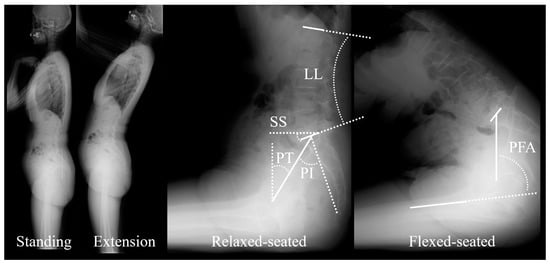 Lateral radiographs in free standing (Standing), standing with extension (Extension), relaxed-seated and, flexed-seated positions. Main radiological parameters are reported: sacral slope (SS), pelvic tilt (PT), pelvic incidence (PI), lumbar lordosis (LL), and pelvic-femur angle (PFA).