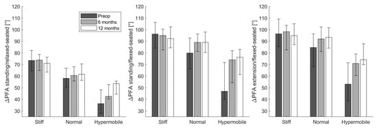 When moving from a standing to a relaxed-seated position, ΔPFA was significantly increased 12 months after THA compared with preoperatively (ΔPFA: 63.8° compared with 59.4°; p < 0.001, Table 3). Similarly, ΔPFA when moving from standing to a flexed-seated position significantly increased postoperativelyΔPFA from standing to a relaxed-seated position or a flexed-seated position in stiff pelvis group (ΔSS ≥ −10°) was significantly larger than normal (−10° > ΔSS > −30°) and hypermobile pelvis group (ΔSS ≤ −30°, Figure 2). There was no significant difference between ΔPFA before and after THA in the stiff group. However, ΔPFA from standing to a relaxed- or flexed-seated positions in normal and hypermobile group were significantly increased 6 months and 12 months after THA compared with preoperatively.