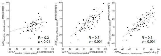 Correlation between the change of ΔPFA and ΔSS between preoperative and 12 months postoperative form standing or extension to relaxed- or flexed-seated position.