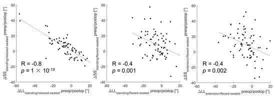 Correlation between the change of ΔLL and ΔSS between preoperative and 12 months postoperative form standing or extension to relaxed- or flexed-seated position.