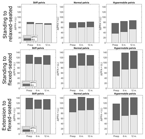 From the standing to the relaxed-seated position, the change of ΔPFA between preoperatively to 12 months postoperatively was correlated with the change of ΔSS (R = 0.3, p < 0.01, Figure 3). Interestingly, the change of ΔPFA from a standing or extension to a flexed-seated position was strongly correlated with the change of ΔSS (r = 0.8, p < 0.001). The change of ΔSS from a standing to a relaxed-seated position between preoperatively and 12 months postoperatively was also strongly correlated with the change of ΔLL (R = −0.8, p < 0.001) (Figure 4). Overall sagittal flexion (ΔLL + ΔPFA) from a standing or extension to a flexed-seated position significantly increased 6 month and 12 months after THA in patients with hypermobile pelvis, compared with preoperatively (Figure 5), but not in normal and stiff pelvis.