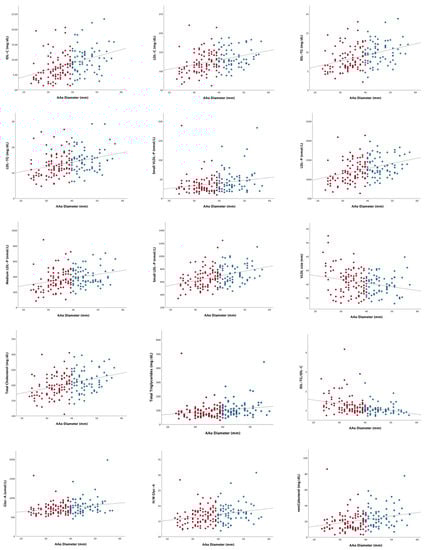 Association between the lipoprotein and glycoprotein profiles and the ascending aorta diameter in the bicuspid aortic valve patients. Red dots correspond to BAV patients without AAD while blue dots correspond to BAV patients with AAD. Complete correlations and p values can be found in Supplementary Table S1. AAo: ascending aorta; remCholesterol: remnant cholesterol; TG: triglycerides; C: cholesterol; IDL: intermediate density lipoprotein; LDL: low density lipoprotein; VLDL: very low density lipoprotein; p: particles; GlycA: glycoprotein A signal; H/W GlycA: height/weight ratio for glycoprotein A signal.