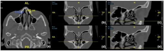 (a) Anteroposterior and transverse diameters of the inner bony canal in axial view. The diameters were measured at three levels: the entrance point at inferior orbital margin (b,c), the exit point at the opening of inferior meatus (d,e), and the minimum transverse diameter along the bony canal.