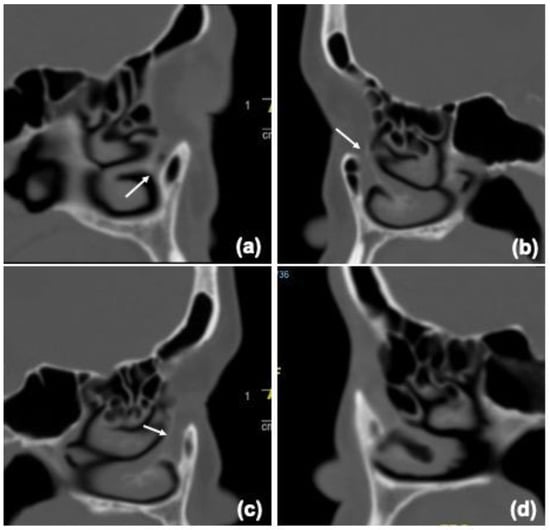 Anatomical variation of the bony nasolacrimal duct (BNLD) is also a crucial risk factor for PANDO. Narrowing of the bony canal may cause stasis of the tear flow, accumulation of debris and inflammatory products, adhesion and fibrosis of the internal nasolacrimal duct mucosa, and finally obstruction of the drainage pathway. Some studies have compared the diameter of the BNLD among normal individuals of different age groups, sexes, and ethnicities [7,8,9]. One study reported a smaller diameter of the BNLD in the PANDO group than in the control group; however, other studies have reported no significant difference in the BNLD diameter between the groups [7,10,11,12,13]. Therefore, the results on the role of BNLD morphology in the development of PANDO are controversial. Because of the anatomical proximity, the lacrimal drainage pathway may be affected by pathology in the nasal cavity and paranasal sinuses [14]. Relationships between PANDO and paranasal sinusitis, nasal septum deviation (NSD), the angle between the bony inferior turbinate and nasal lateral wall at the end of the nasolacrimal duct, and structural abnormalities of the sinonasal cavity have been studied [15,16,17,18]; however, the results are inconclusive.