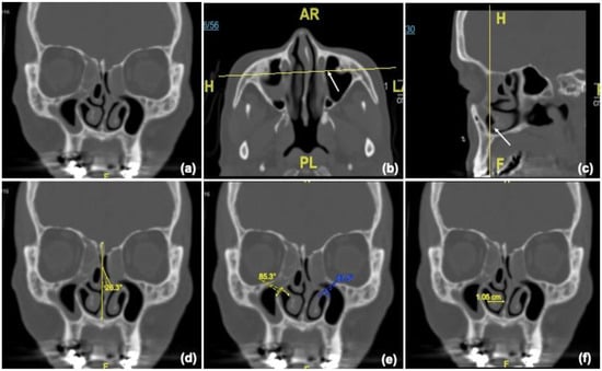(a) Coronal sections corresponding to the most distal part of the BNLD were selected (b) from axial and (c) sagittal CT images. Measurements included NSD angle (d), angle between the bony inferior turbinate and medial wall of the maxillary sinus (e), and transverse mucosal thickness of the inferior turbinate (f).