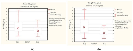 The serum concentrations of sITGaM and sITGb2 were significantly higher in patients with long-term pulmonary complications (P(+)) as compared with the control P(−) group (sITGaM 18.63 ng/mL IQR 14.17–28.83 vs. 14.75 ng/mL IQR 10.91–20 p = 0.01 and sITGb2 10.55 ng/mL IGR 6.53–15.83 vs. 6.34 ng/mL IGR 4.98-9.68 p = 0.002) (Figure 1a,b).