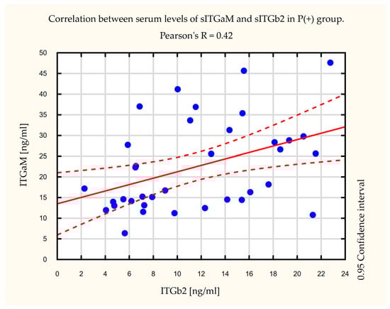 Moreover, we observed a statistically significant correlation between sITGaM and sITGb2 elevation in the P(+) group. Pearson’s correlation factor was R = 0.42, p = 0.01 (Figure 2). In the P(−) group, this correlation was not observed (data not shown).