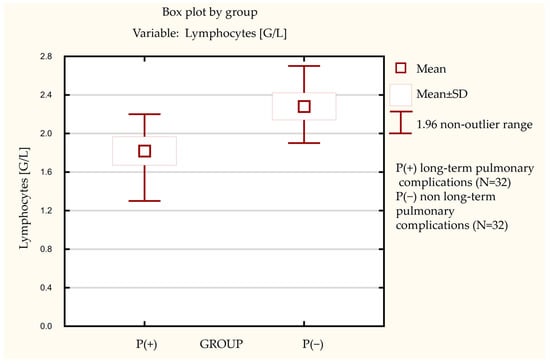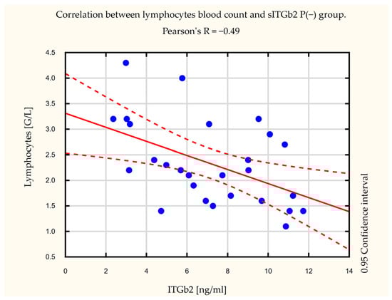 Additionally, we noted a statistically significant difference in lymphocyte blood count levels between the studied groups (Figure 3). Patients in the P(+) group had lower (mean = 1.82+/−0.84 G/L) lymphocyte levels than the P(−) group (mean = 2.28+/−0.79 G/L). Furthermore, we observed an inverse correlation between peripheral blood lymphocyte levels and sITGb2 integrin subunit levels in the P(−) group. Pearson’s correlation factor in the P(−) group was R = −0.49, p = 0.01 (Figure 4). In the P(+) group, this correlation was not observed (data not shown).