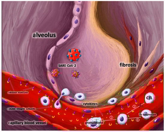 The role of soluble integrin subunits in post-COVID-19 infection.Shedding and releasing a large number of soluble integrin subunits from immune cells could lead to several effects: ① granulocyte activation; ② inhibition of CTL differentiation; ③ impairment of Th lymphocyte regulatory function. Moreover, soluble integrin subunits mask adhesion molecules in endothelium and inhibit diapedesis of immune cells to the place of action. The above mentioned processes lead to lung lesions. Abbreviations: CLT-cytotoxic lymphocytes,Th-helper lymphocytes.