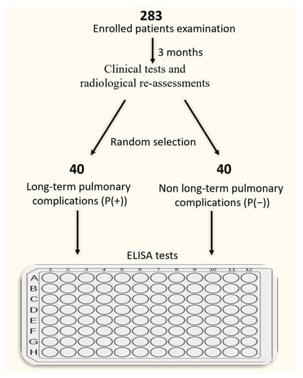 We enrolled 283 patients (mean age = 55 ± 12) from the Outpatient Clinic and Department of Pneumology of the Medical University of Lodz from 2020 to the end of 2021, who were recovered from COVID-19. In all patients, viral infection was confirmed by real-time polymerase chain reaction test (RT-PCR). From the entire study cohort, we selected 80 patients for further investigation (40 subjects for each group), as described below. Pulmonary manifestation of long COVID-19 was defined by lung lesions, with or without decreased parameters of pulmonary function tests (PFTs), which persisted after approximately 3 months after recovery from active COVID-19. This group was labelled as P(+). The control group consisted of patients who had recovered from COVID-19 and neither presented lung lesions nor decrease in PFTs in a 3-month follow-up. Patients in this group were selected randomly using the web-based tool served by the research randomizer page (https://www.randomizer.org, accessed on 23 March 2022). This group was labelled as P(−). Smokers and ex-smokers were defined according to recommendations of the Center for Disease Control and Prevention [23]. We performed a comprehensive assessment of the participants, presented in Table 1. The Experiment design was shown in Scheme 1.